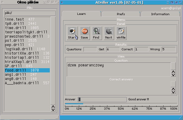 Program powstał dzięki inicjatywie pepson'a. Podsunął mi pomysł, by zreanimować starego Drillera. Działanie programu jest zgodne ze starym Drillerem, przypomnę, że jest to programik do szybkiej nauki-zapamiętywania słówek. Ponadto wpadłem na kilka nowych pomysłów, wprowadziłem nowe funkcje np.: (nauka w formie TEST-u ) (zapis rozgrywki, którą możemy dokończyć później) i wiele innych udoskonaleń. Programik ma status FREEWARE, więc dozwolone jest kopiowanie, rozpowszechnianie bez zgody autora.