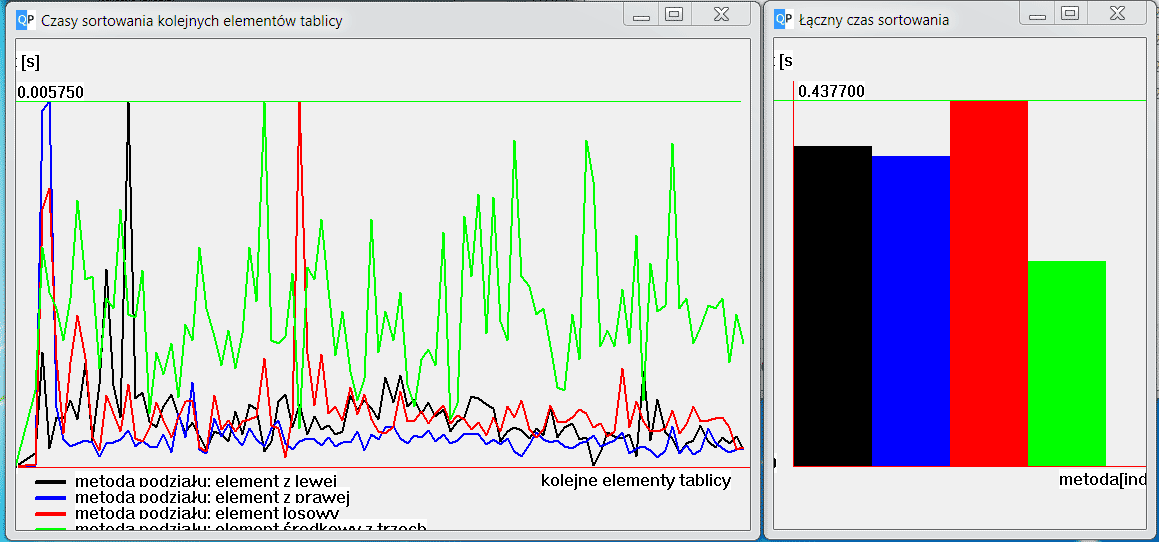 Pokazuje kolejne kroki algorytmu, oblicza czas operacji działania algorytmu, i na podstawie zebranych danych generuje dwa wykresy. Dane mogą być wczytane z pliku. lub generowane losowo. W programie zastosowano 4 metody wyboru elementu dzielącego tablicę na dwie poddablice, które są poźniej sortowane. Szybkosć sortowania metody QS zależy od odpowiedniego podzielenie tablicy z danymi do sortowania.